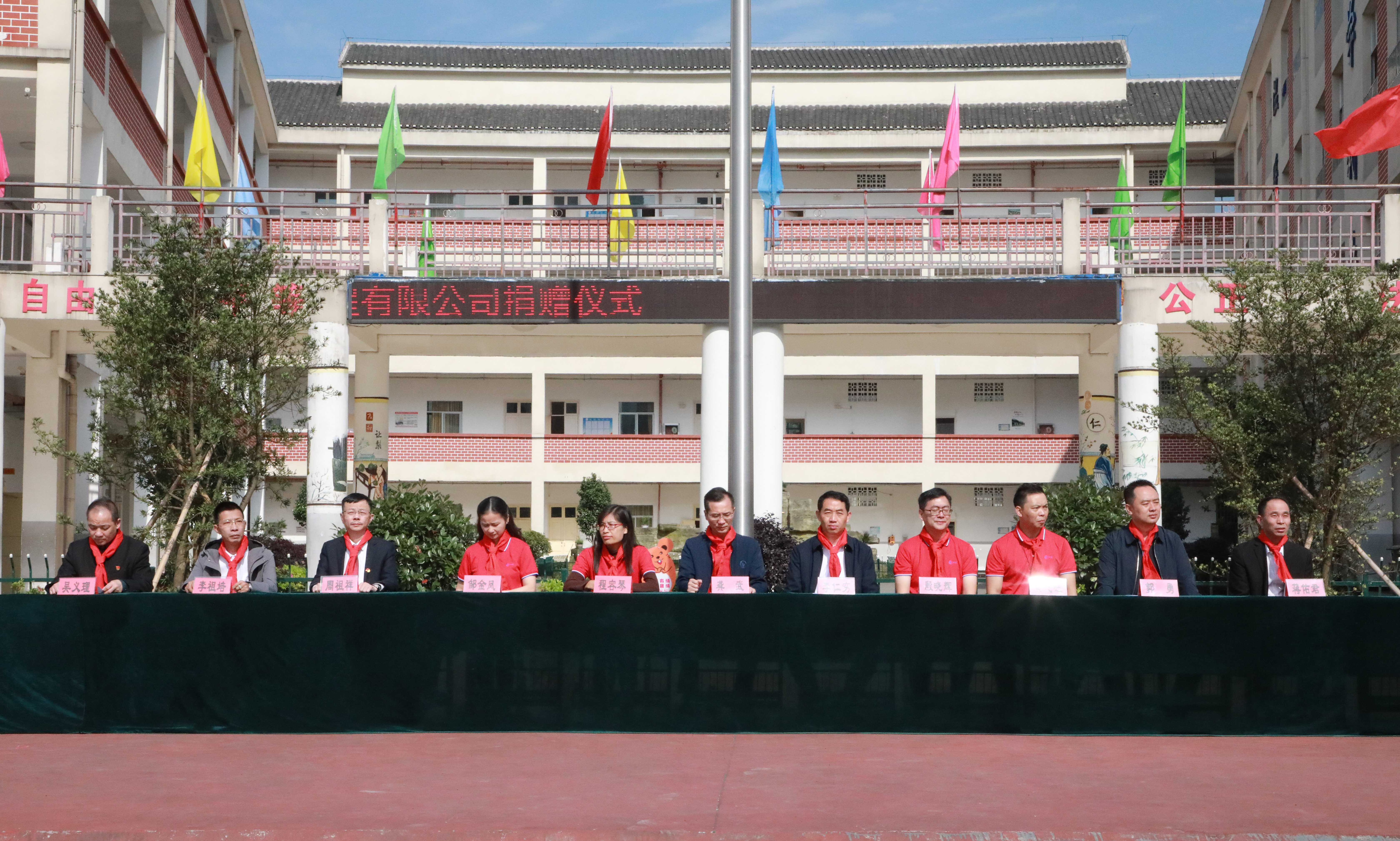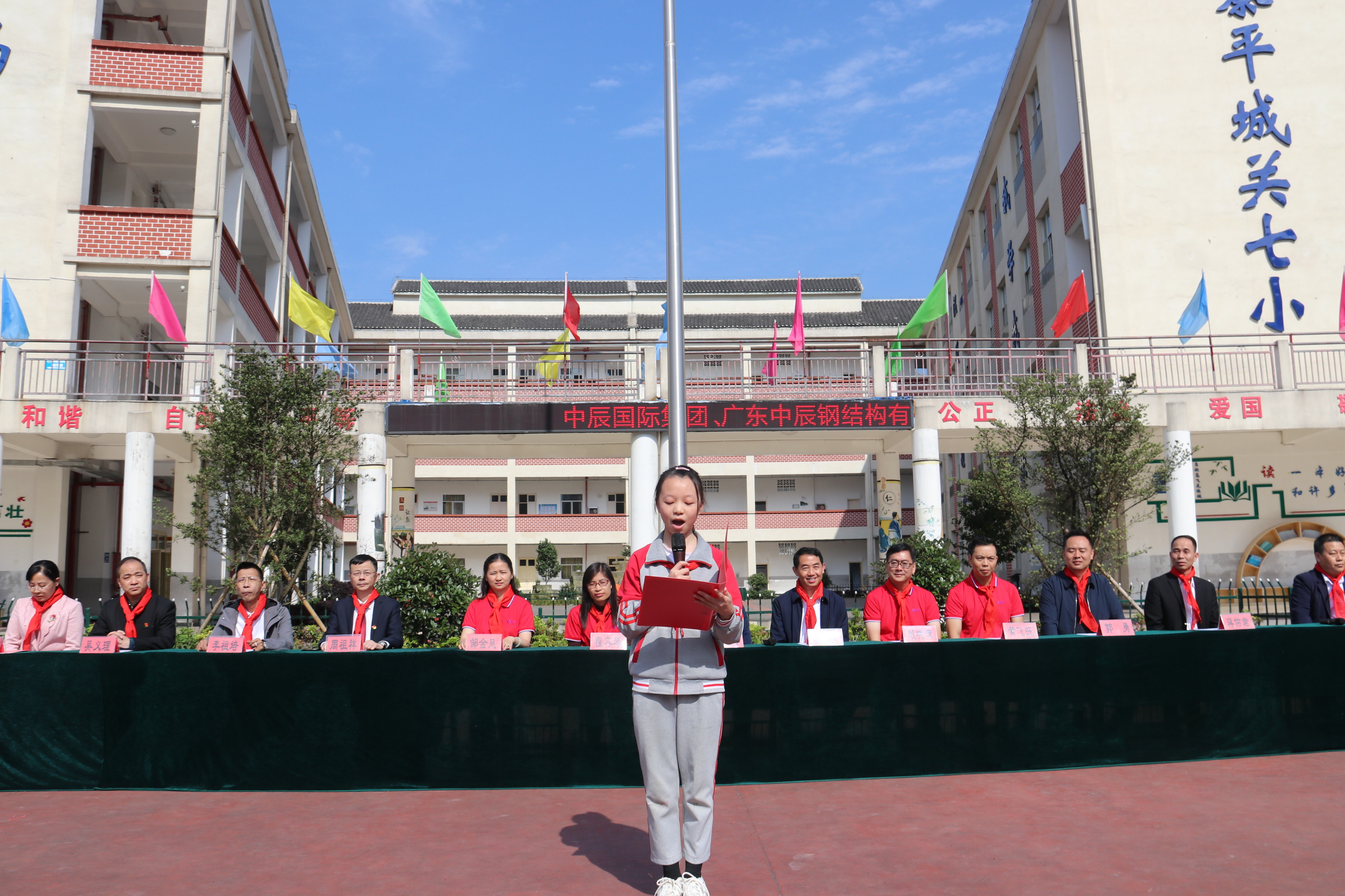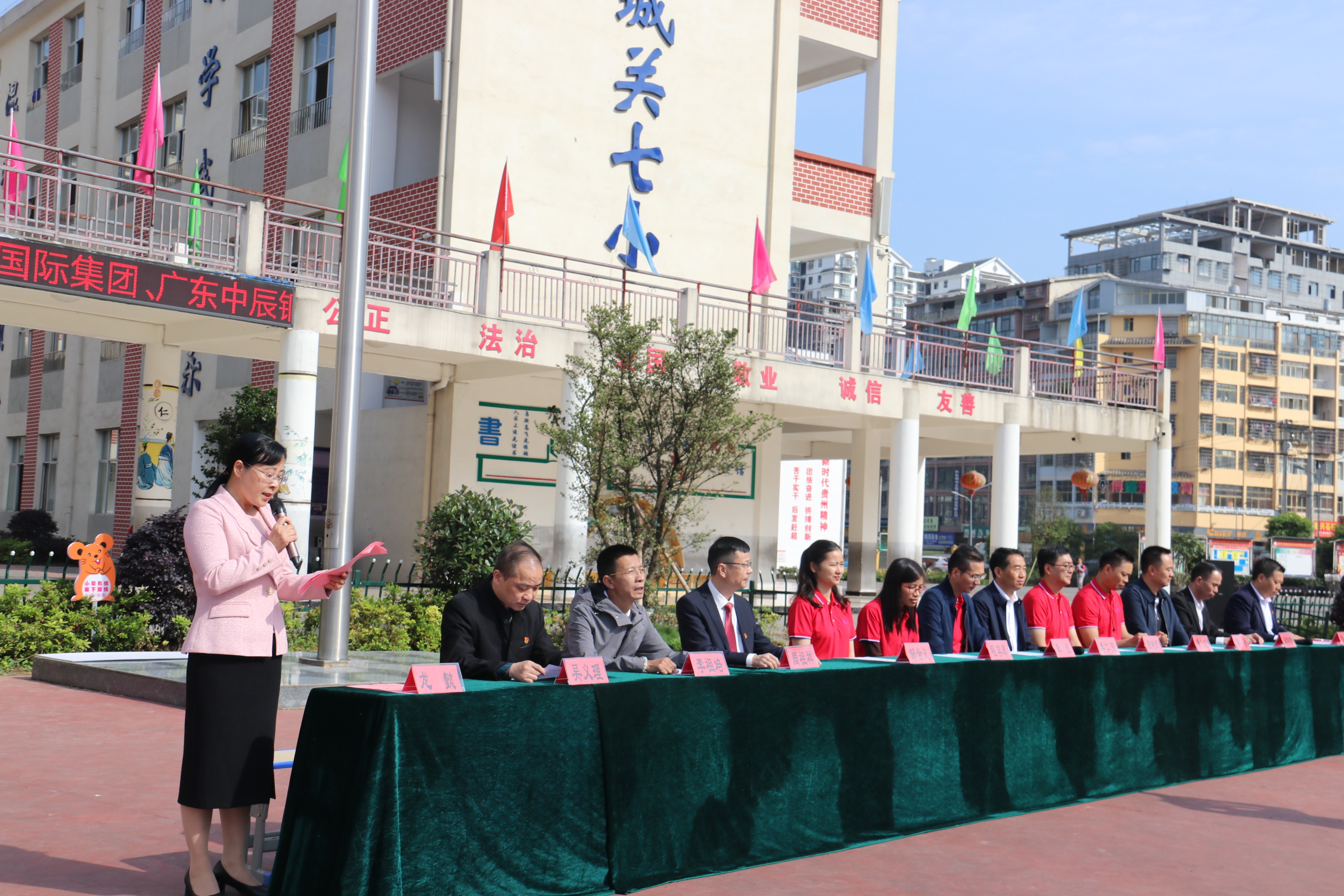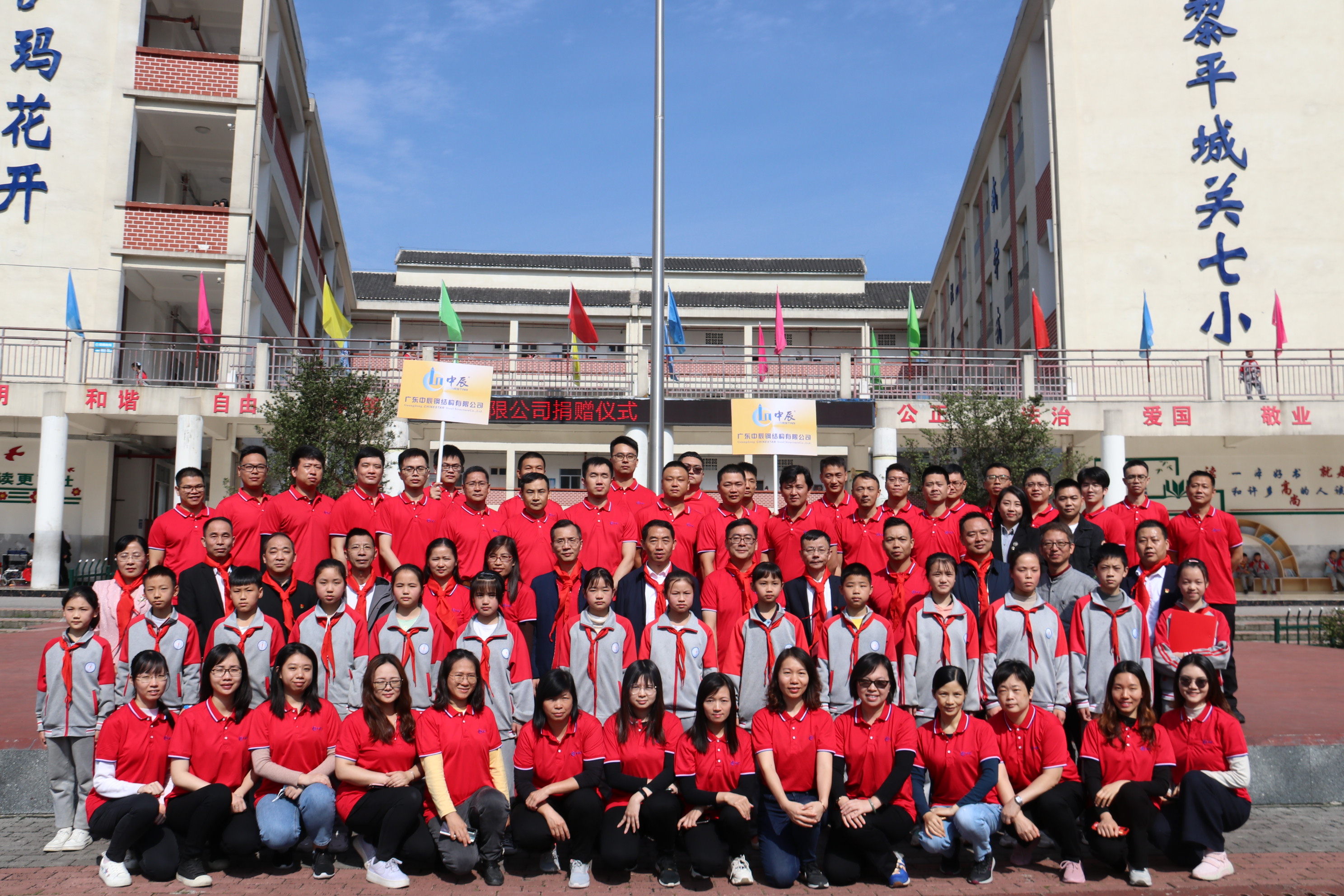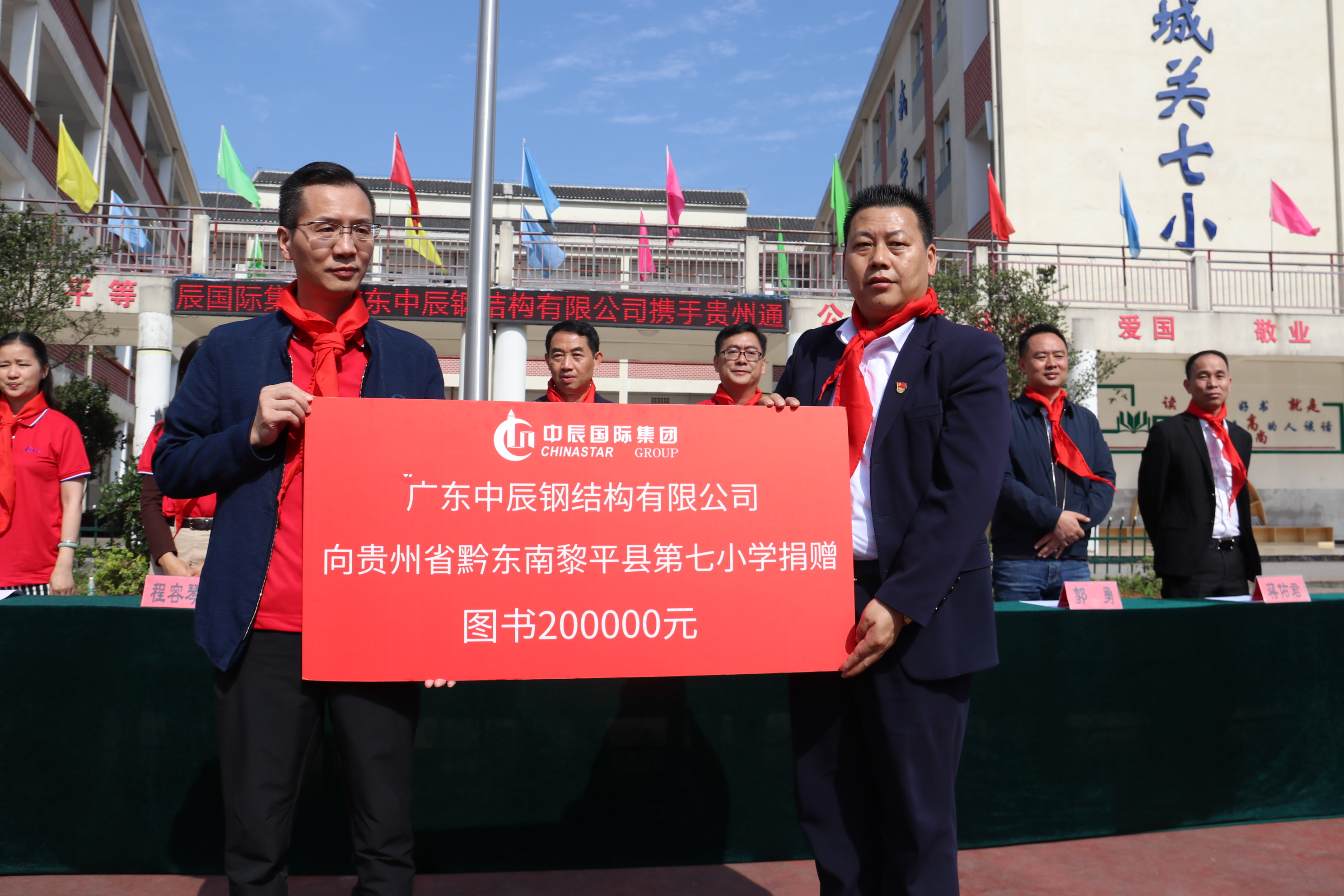 中辰国际集团中辰钢构有限公司董事长龚武、总工程师程容琴、副总经理殷晓辉、总经理助理黄飞旺、总经理办副主任、董事长秘邹金凤、贵州中鑫丝路文化传播有限公司总经理郭勇和中共黎平县委常委、县委统战部长李仁穷、县委统战部副部长、县工商联党组书记吴义理、贵州通建建设工程有限公司董事长、黎平居然之家董事长周祖祥、贵州通建建设工程有限公司法定代表人、总经理李祖培、黎平居然之家副董事长蒋佑君以及黎平县城关第七小学全校师生等参与本次捐赠仪式。