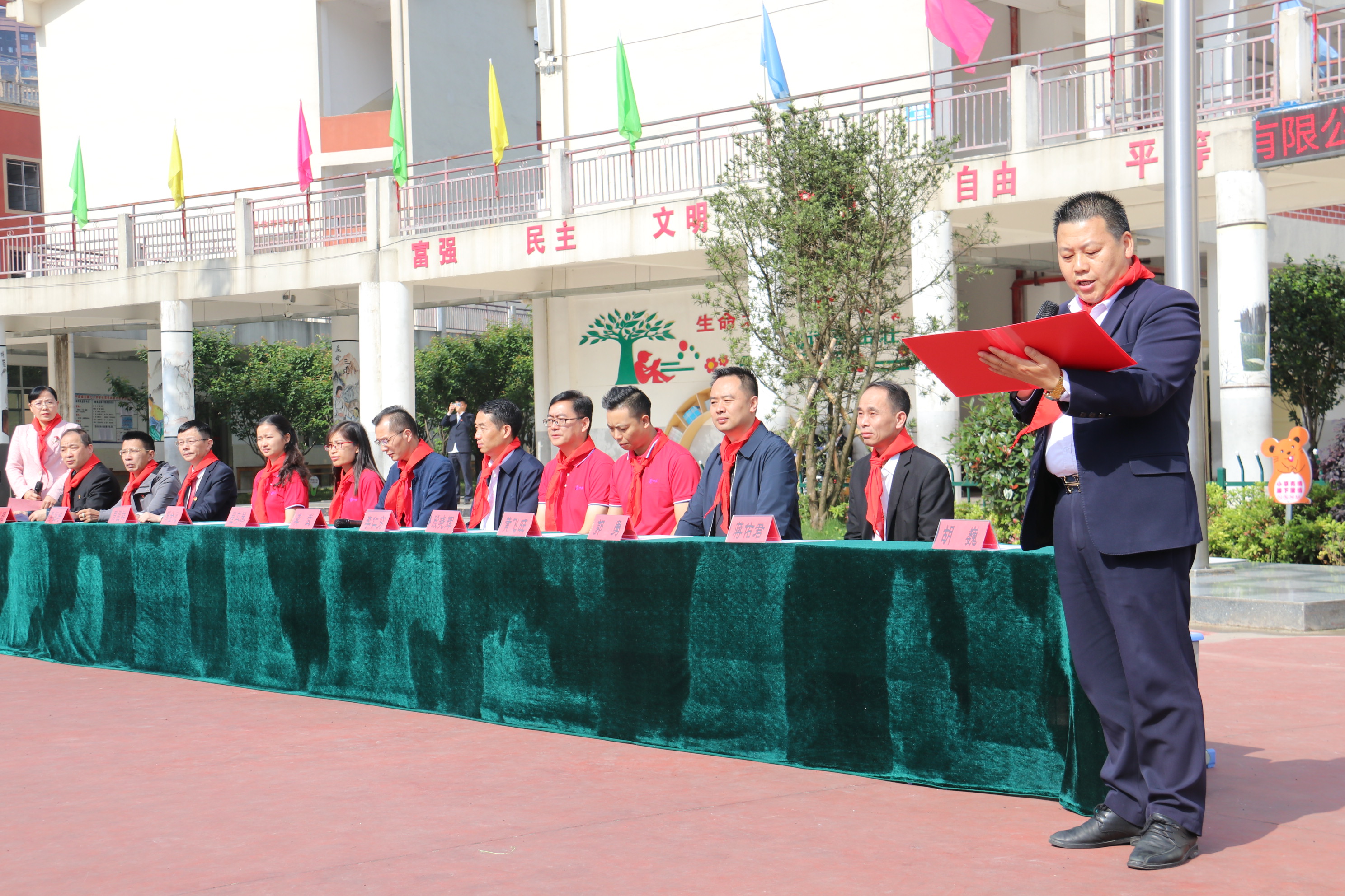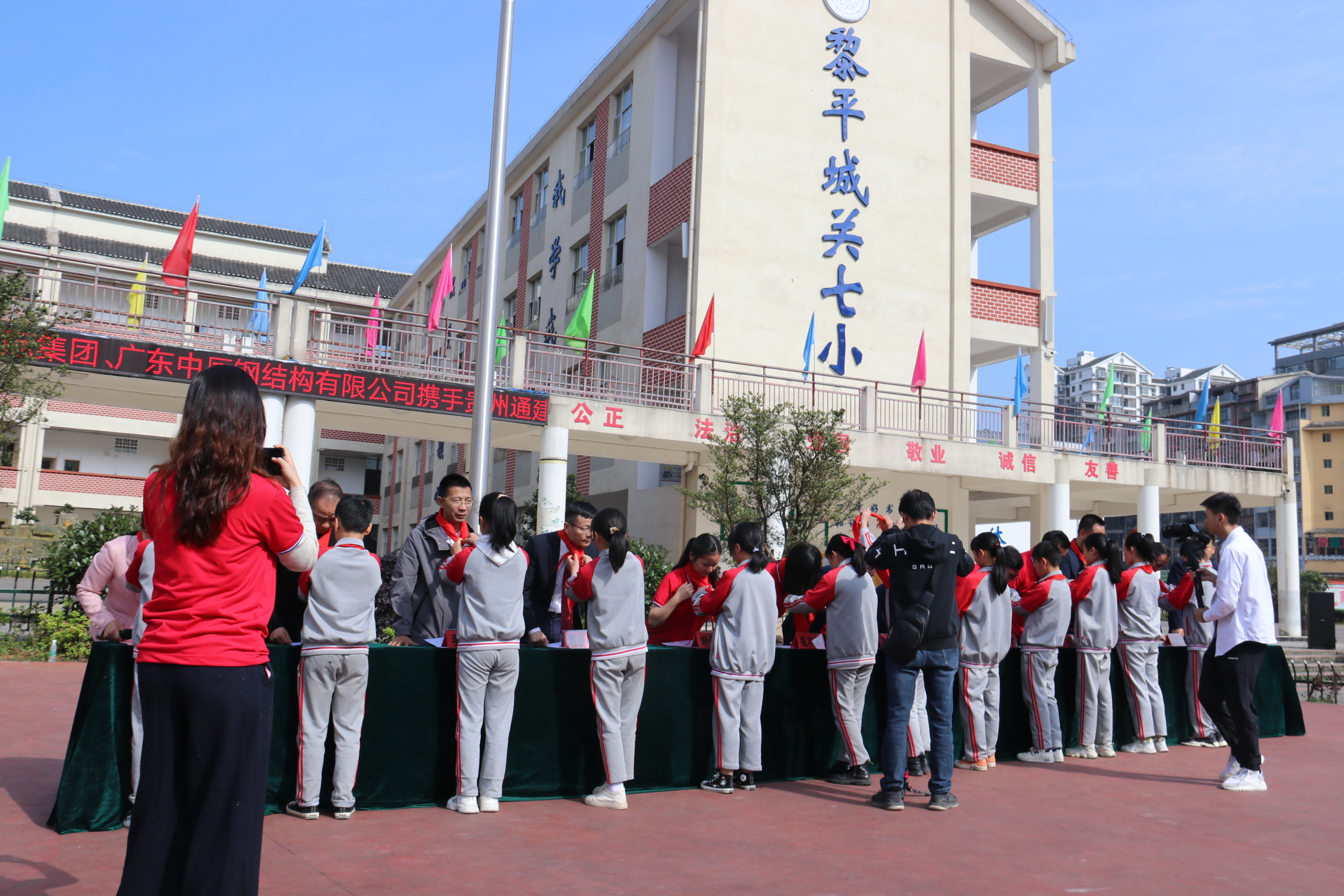 捐赠仪式上,首先由黎平县城关第七小学学生代表为主席台上的领导和嘉宾敬献并佩戴红领巾。