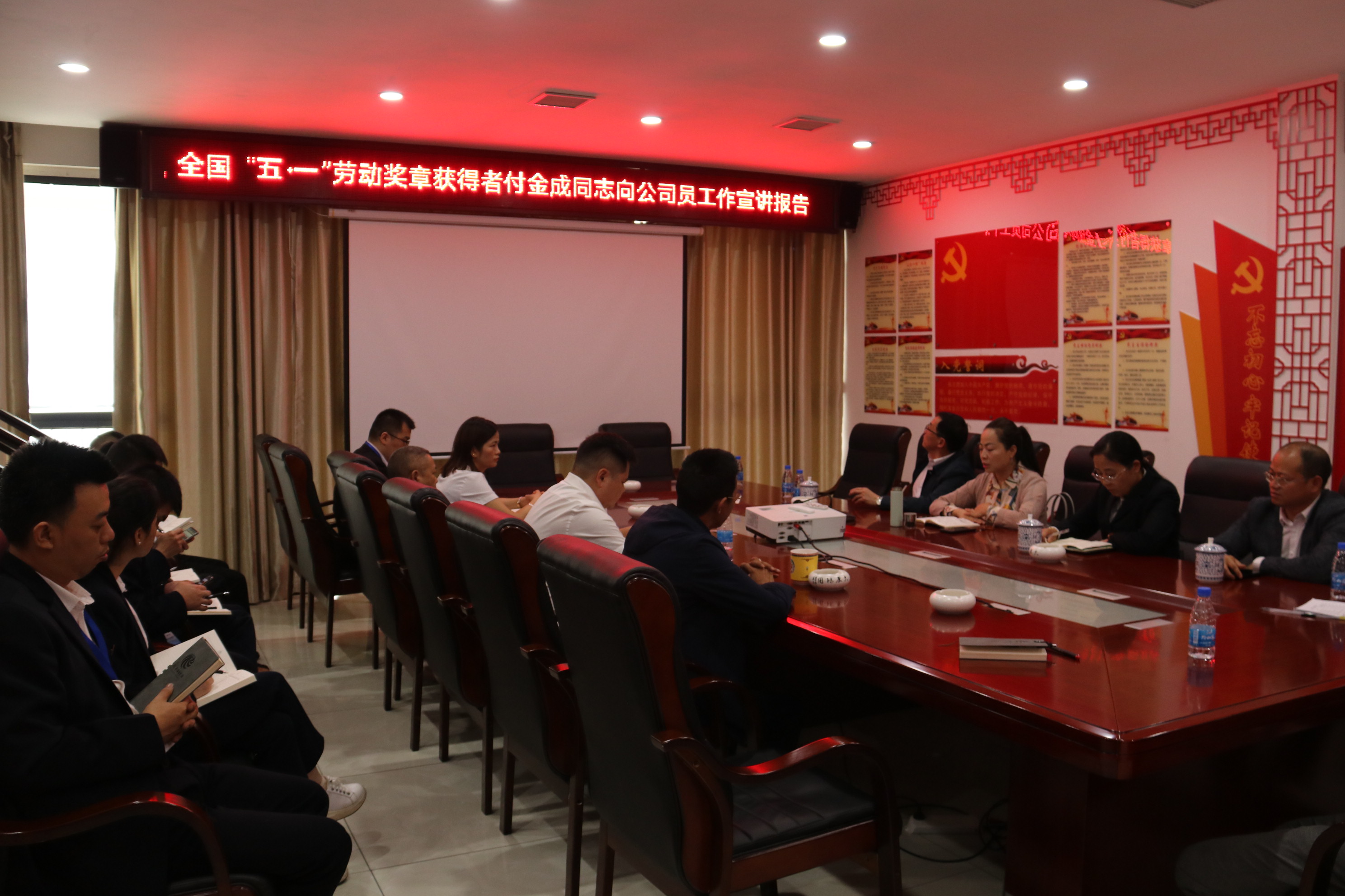 2021年5月30日下午,贵州通建建设工程有限公司在公司会议室举行全国五一劳动奖章获得者宣讲报告会,县人大常委会副主任、县工商联主席邰胜英、县委两新工委专职副书记杨旭、县委统战部副部长潘承渊、县总工会党组书记龙懿、县住建局副局长陆正彩等和贵州通建建设工程有限公司副董事长付清武、总经理李祖培以及公司全体员工,听取了荣获全国“五一劳动奖章”荣誉称号的付金成同志的宣讲报告,并与付金成同志进行座谈、互动交流。