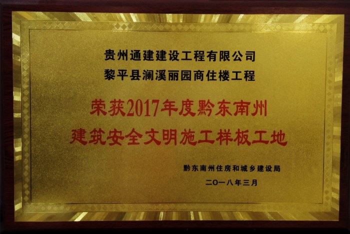 【概要描述】 位于黎平县德凤街道西门冲的阑溪丽圆商住楼,是贵州通建建设工程有限公司承建的重点工程项目“阑溪丽圆公租房建筑群”的缩影,也是我公司精心打造的形象样板工程的一个亮点,经公司全体员工的共同努力,“阑溪丽圆商住楼工程”被评为黔东南州“建筑安全文明施工样板工地”,填补了公司在州一级示范工程评比中中奖的空白。